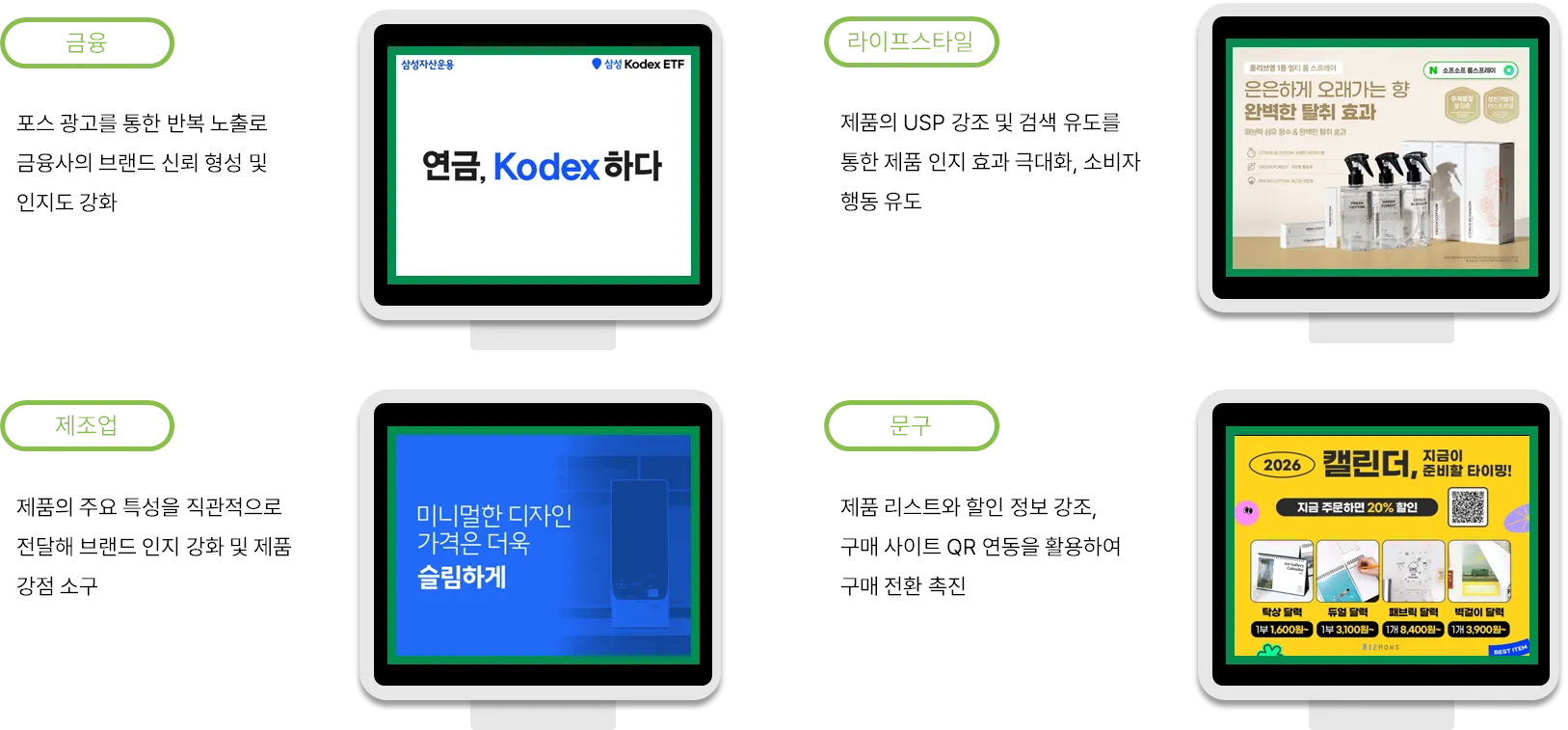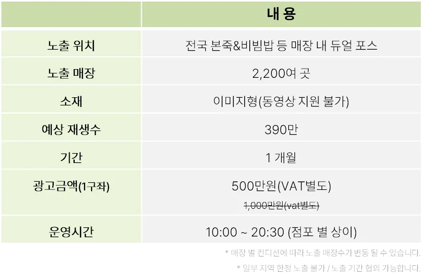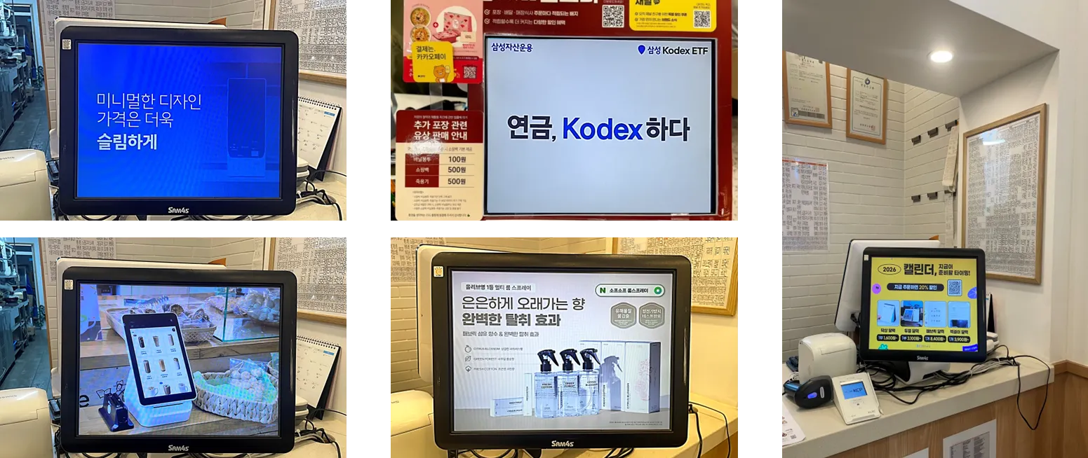 대기 및 결제 시간 동안 고객의 시선이 집중되는 터치 포인트에서 반복 노출되어 브랜드 인지도 제고에 효과적입니다.