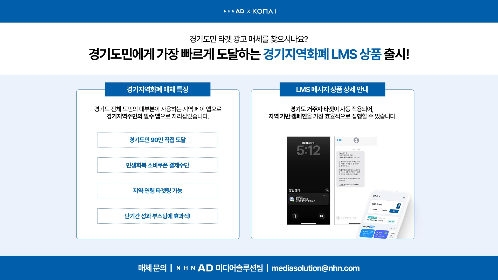 경기도민 대상 문자 발송으로 이벤트 및 프로모션 정보를 직접 전달할 수 있는 상품으로,