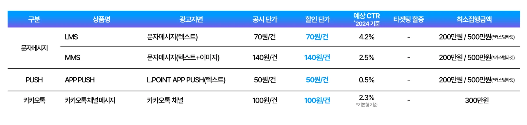 롯데 그룹사 데이터를 바탕으로, 기본 성/연령 및 구매 이력 타겟팅과 함께 별도 세분화된 세그먼트 타겟팅 활용 메시지 발송이 가능합니다.