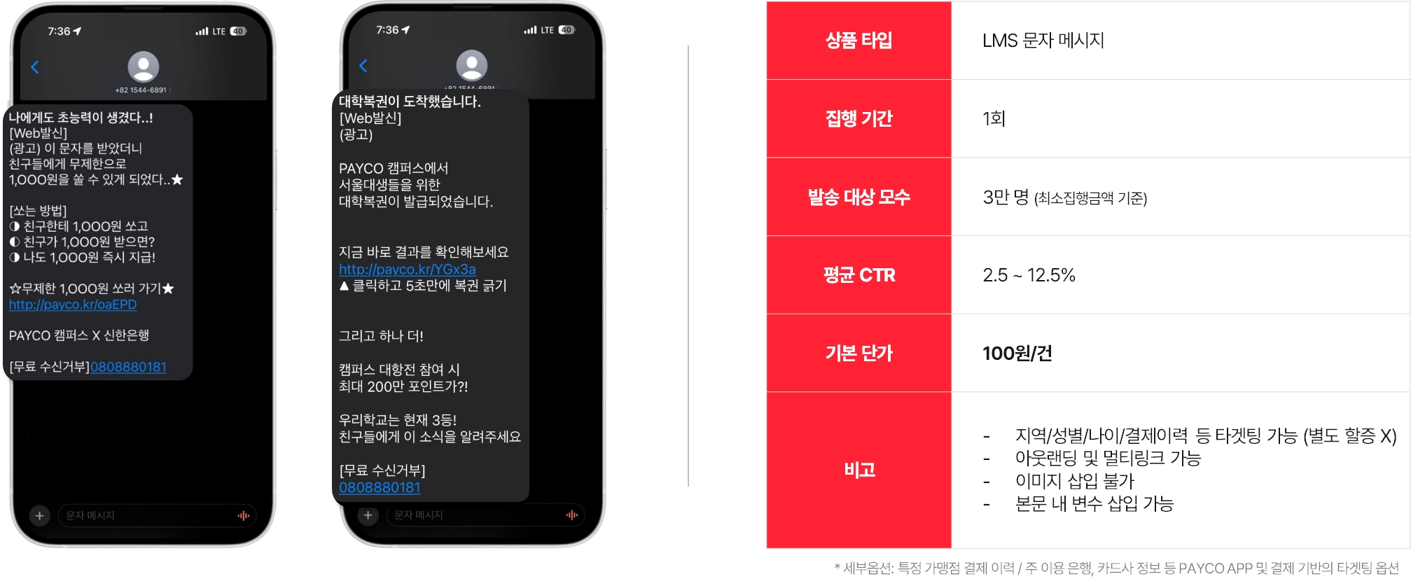 PAYCO 캠퍼스 인증이 완료된 대학생에게 고효율의 메시지를 발송하는 LMS 상품
